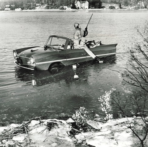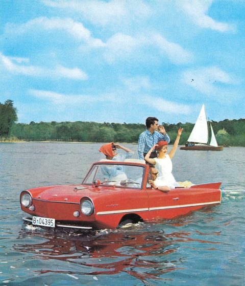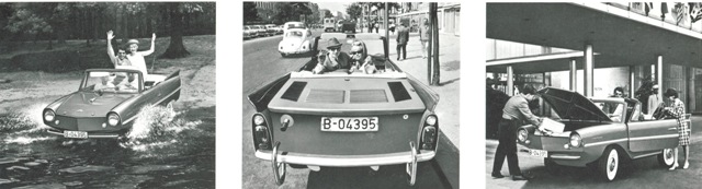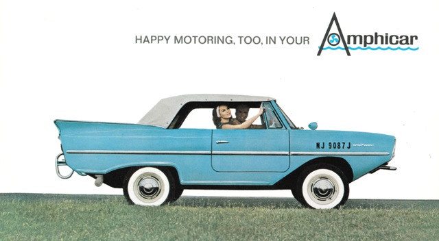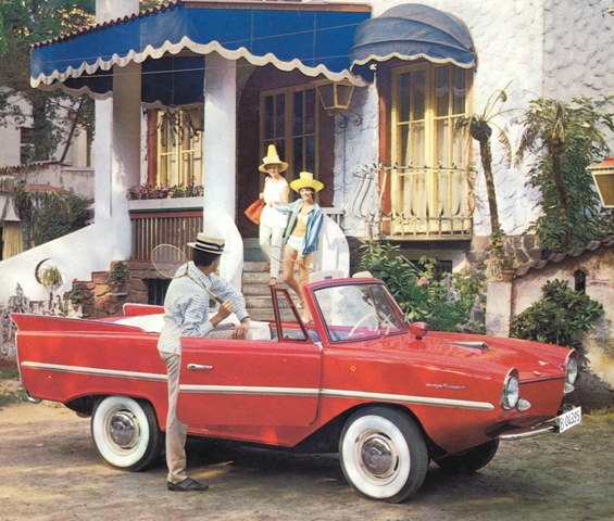 The Amphicar was a revolutionary automobile design that could be driven on both land and water. The principle of the Amphicar was a self-supporting, floating body design. The Amphicar front wheels acted as twin rudders, for fast, responsive handling in the water. The Amphicar, offered water tight doors with double-locks and double seals. The upholstery and floor mats were soil-resistant and waterproofed as well.