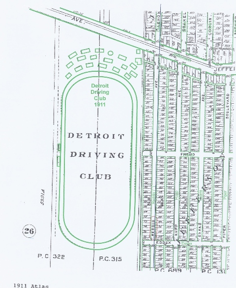 The first Detroit Driving Club, also known as the Hamtramck Racetrack, was founded in 1832 at Jefferson and Van Dyke, in Hamtramck Township. The Detroit Driving Club organization was founded in 1884 by D. J. Campau, Jr., for the purpose of promoting horse racing. Daniel was the grandson of one of the original settlers, Joseph Campau, who controlled large tracts of real estate. In 1894, the long established Hamtramck track was relocated to Campau’s property in the Fairview area of Grosse Pointe Township. The new Detroit Driving Club usually ran sulkies or harness racing as well as thoroughbred- racing. The inaugural race was held on July 17, 1894, and the final day of racing activity for this track was August 5, 1911. The entrance to this well-built facility, designed by noted Detroit architect Mortimer Smith, was at Algonquin and Jefferson. The southern limit of the track was at what is now Essex Avenue. This facility had a 5,000 seat covered grandstand, a 3 storey Victorian clubhouse, 17 horse barns that held 25 horses each in comfort, an electrical power house, a caretakers house, a club secretary residence, and even a wharf for steamboats to tie up at the river to deliver spectators. They could also take the Citizens Street Railway street car from Detroit up to the brick-paved entrance into the track.