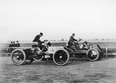 Detroit Automobile Company Principal Henry Ford Pulls Up on the Outside on Fellow Auto Builder Alexander Winton During the Grosse Pointe Feature Ten Mile Run in 1901.