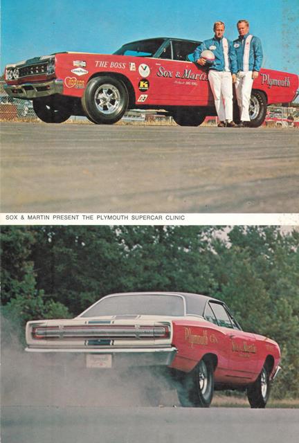 The two racers made headway and generated the Sox & Martin Super Car Clinics featured at many Plymouth dealerships. This feature became a popular guideline for high performance enthusiasts among Mopar fans. As part of the promotional effort, Sox & Martin Drag Racing Clinics toured dealerships across the country to offer racing advice and to speak to their fans about high performance vehicles.