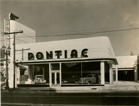 1937 Pontiac Dealership’s created large showcase front windows and prominent signage in prime locations. Significant service areas and parts selling was part of the setup