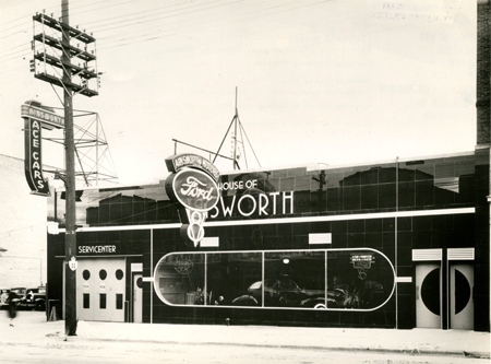 Answorth Ford Dealership in 1939 featured an Art Deco dramatic front with shiny black granite and curved showcase windows. The “Servicenter” was located predominately at the front of the building.