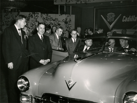 A Detroit Cadillac Dealership showroom floor in 1950. An opening event to showoff the new Cadillac models was a major happening bringing out car fans to see the new styles, kick the tires, and get behind the wheel.