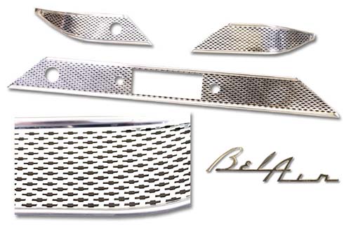1955 BelAir Dash Trim Set, Stock, Includes Gold Script. The highest quality trim kit on the market today. Show quality parts made from industry standard “auto brite” for maximum durability and superior beauty. As always, we include the correct (genuine gold plate) scripts with each set of dash trim.