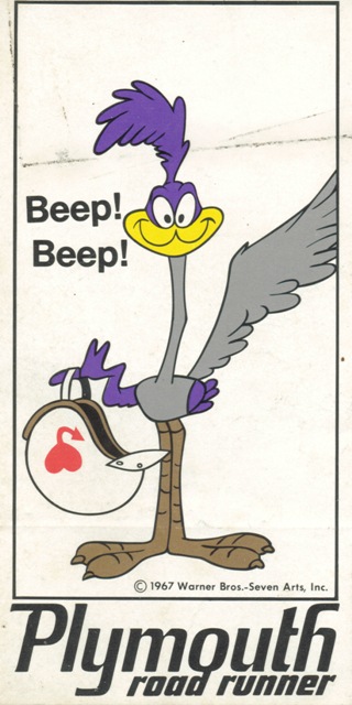The Plymouth Road Runner Bird and Chrysler offered fans the most famous cartoon character name used on Plymouth models in the 1960's and 70's. Jack Smith was the man who conceived the idea of the Road Runner and Plymouth models. Mr. Smith was the product planning manager for Chrysler in the 1960's . It all began in mid-1967 after the new 1968 Plymouth models were completed and released to the buying public. Bob Anderson was newly appointed to general manager for Chrysler-Plymouth sales and marketing. Mr. Anderson wanted to dazzle the youth market beyond the inroads being made by the 1967 Plymouth GTX which was challenging the muscle car of the Pontiac GTO. Jack Smith and Bob Anderson were the two people responsible for using the cartoon bird from Warner Bros that became a great tie-in success for Plymouth advertising to spread the word. In the late 1960's, Plymouth dealers had various promotional give-away items for buyers and fans of its super car programs. Below is an original 1967 Road Runner decal sticker that was given out by Plymouth dealerships across the country and is very collectible and rare among enthusiast today.