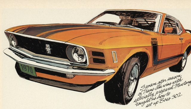 The 1970 Ford Mustang Boss 302 was a high performance model produced in 1969 and 1970 for the Trams- Am racing series. Ford has recently revived the Boss 302 for the 2012 model year. The world Boss was chosen because it was a hip and contemporary word from the 1960's that describes "The Best". Ford also used the name Boss in their advertising for the 1903 Ford touring car which sold for $850. In 1970, the Ford Mustang Boss advertising were featured as two page magazine spreads and one page ads as well. All advertising made excellent visual association with production Mustangs and their Trans-AM and drag -racing connections. The Boss 302 Mustang was designed by Larry Shinoda. The distinctive styling included optional black horizontal rear window shades and blackout hood treatment. It was one of the first production cars with a front spoiler and rear deck wing. A total of 7,013 1970 models were produced and were offered for $3,720. In Trans-Am racing Ford entry was the 1969-70 Boss 302 Mustangs. The factory effort was headed up by the famed Bud Moore, who fielded two cars in the 1970 season, and won the championship that year. Mustang Trans-Am advertising mostly appeared in Road and Track and Car and Driver magazines and is highly collectible today.
