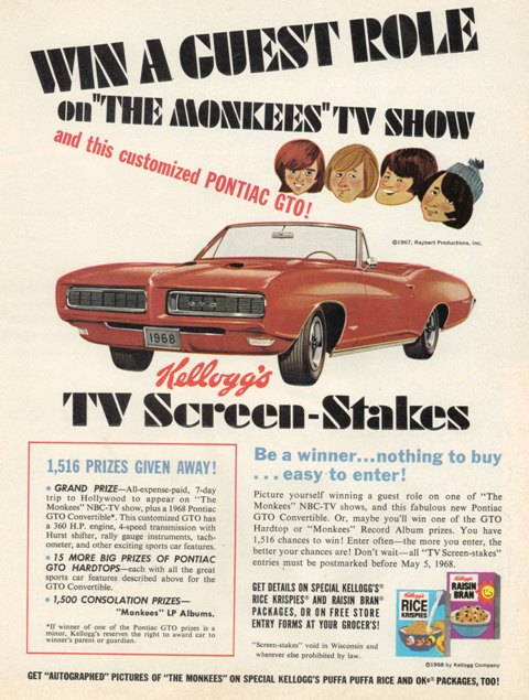The Judge by Pontiac will always be American Icon among car collectors. The GTO Judge debuted in December 1968 and offered a rear-deck spoiler, blackout grille, and decals decorated the Judge body. The GTO was the brainchild of Pontiac chief engineer, John Delorean. Street performance was something Pontiac's advertising and marketing was heavily involved in the 1960's. The Judge name was Delorean's idea that was inspired by the Ferrari 250 GTO, the successful race car. For 1968 the GTO line included the Judge which had a redesigned body line for Pontiac design team with more curvaceous, fastback styling, and concealed headlights were a popular option. A unique feature was the body color and a endurance front bumper that was designed to absorb impact without permanent deformation at low speeds, Pontiac used this feature heavily in their advertising campaign. Kellogg's, the cereal company, and "The Monkees", the TV show, teamed up with Pontiac in a advertising campaign to feature a guest role on one of the Monkees NBC-TV show, plus a new Pontiac GTO convertible! It was called "Kellogg's TV Screen-Stakes". The advertising featuring this Kellogg's grand prize give away is very scarce today.