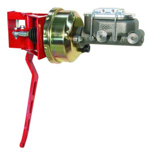 The assembly shown here features a 7-inch power booster (8-inch is also available), Corvette master cylinder, remote conversion lid and the optional slotted pedal arm.