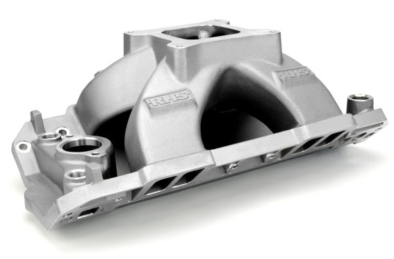 The new RHS® 14-Degree Single Plane Intake Manifold is engineered specifically to fit RHS® 14-degree cylinder heads with a 5-degree intake face. With a tall profile and long runner design, the new manifold provides the power and strong torque curve throughout the mid RPM range that is required for circle track and drag race applications up to 400c.i. This manifold offers the simplicity of a one-piece design with integral water crossover and a lightweight flange for weight critical applications. Female pipe fittings at all four corners allow external water lines for reverse cooling applications. And, with a 4150 flange the RHS® 14-Degree Single Plane Intake Manifold is easy to install in most popular Small Block Chevy applications.