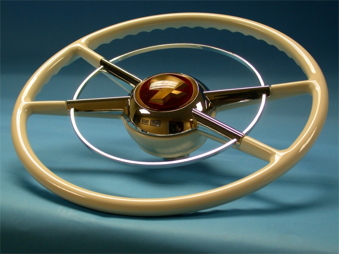 The new wheel is scaled-down from the original 18” diameter to 16” for ergonomics purposes, and is available for GM-style columns or original ’32-’39 and ‘49-‘50 Ford columns. It can be ordered with or without a horn ring, and you can get it in primer, ready-to-paint, or JULIANO’S will be happy to ship you finished one in a black or white painted finish. The new Crestliner wheel features the same high quality craftsmanship as the company’s classic 1940 wheel.