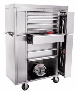 Innovative design features two sliding vertical steel pegboard drawers for large hanging tools. Middle drawer doubles as a work surface and roomy lower cabinet stores larger items. Also features ball-bearing slides, stainless steel side handles,double-pin locking system, hydraulic lid struts and 5-inch heavy-duty casters. Lid stiffener adds strength. Offers 17,293 cu. in. of storage. Dimensions: Overall:41W x 18D x 571/2H 308.7lbs.