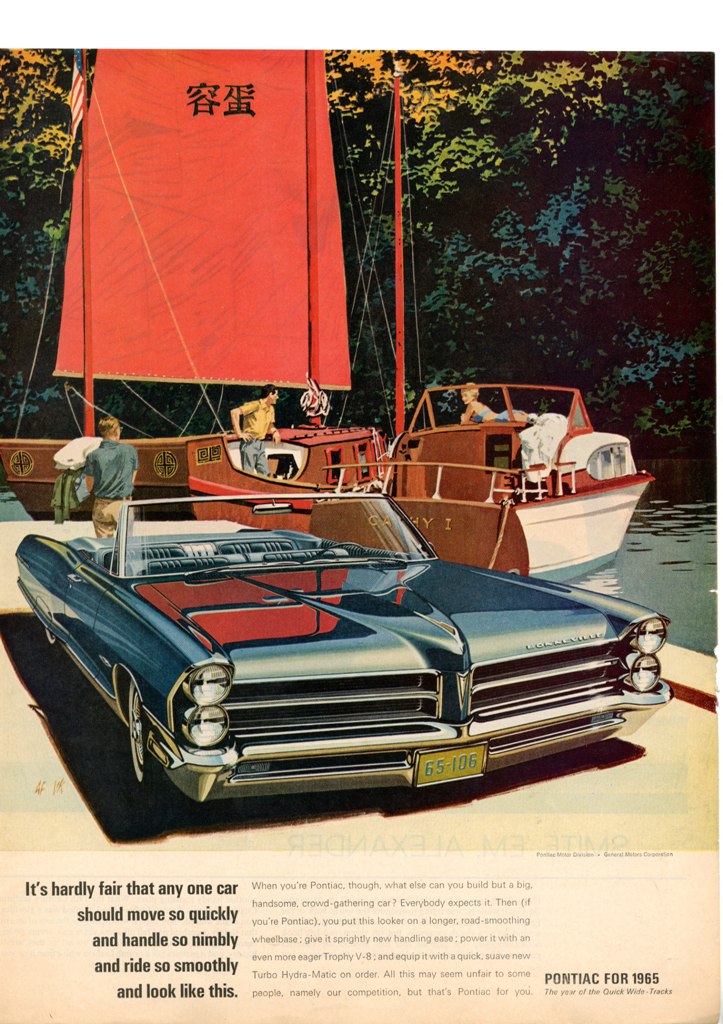 Van and Fritz often worked independently discussing the color schemes and dimensions of an illustration ahead of time and later merged it into one famous picture. After many successful series of advertising for Buick, Van and Fritz were given the opportunity to create a new advertising image for Pontiac. This was the first time their signatures appeared on the advertising of "VK" and "AF". Of the 13 years, many of the brochure illustrations they created were for Pontiac.