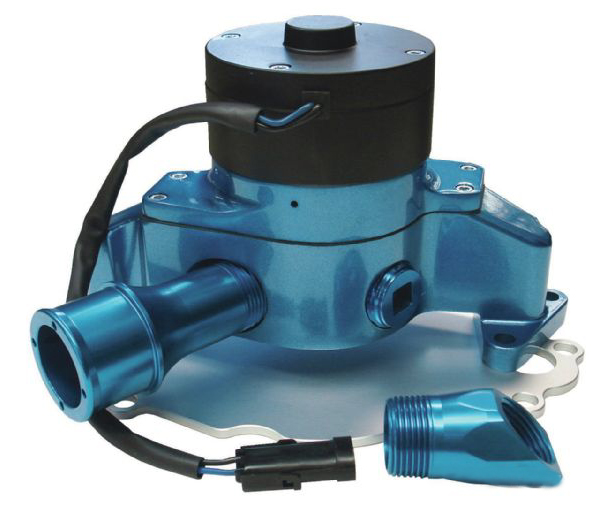 Proform/Specialty Auto Parts has added this durable and lightweight cast aluminum electric water pump (PN 68220B) to their ever-growing line of quality Ford products. The pump is available in red, black, chrome, polished, or blue (as show here). An epoxy powdercoating is applied for corrosion protection and underhood styling. This all-new small-block Ford water pump features a dependable 12-volt electric motor, which draws only 6-amps and pumps up to 35 gallons per minute, and is capable of cooling almost any size engine.