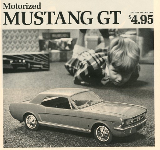 The Mustang design was beyond popular among all ages. During the 1960s, a Battery operated toy Mustang replica was released during the holiday season for $4.95. The AMF Company also designed and produced pedal cars resembling the downsize version of the 1965 Mustang.