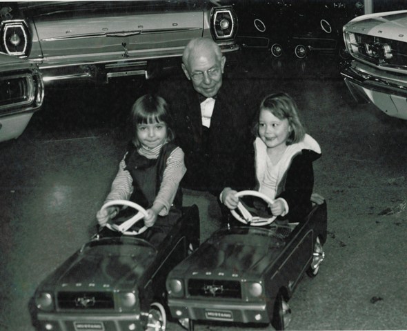 Mr. Al Long, owner-president of Al Long Ford, briefs two prospects from the jet-age set on the performance quality of their kid-size Mustangs.