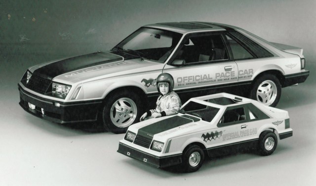Shortly thereafter, F.W. & Associates generated a downsize version of the 1979 Mustang Indianapolis 500 pace car. The Mustang pace cars were made for off road usage only but it impressed so many kids and adults that soon the toy cars were sold throughout Ford Dealerships. A "downsized" version of the 1979 Mustang Indianapolis 500 pace car During 2005, Warehouse 36 recovered the tooling and brought back the Mustang toy design for collectors of all ages.