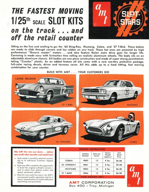 The Mustang slot kits were sold by the AMT Corporation located in Troy, Michigan. The Mustang models were produced in 1/25th scale, packaged 12 models to a case, and sold in hobby stores for $6.00 each. Currently, the Mustang slot car models, if in mint condition, can sell anywhere from $50.00 to $100.00 each.