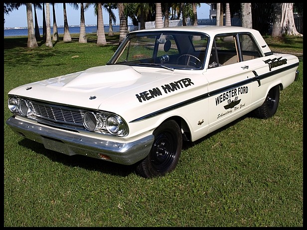 Today the “Hemi Hunter” Thunderbolt is in spectacular condition after being restored by Performance Restorations. It has never been tubbed or fitted with a roll bar, and retains all its original sheet metal beneath the as-original Wimbledon White paint. Most importantly, it also still packs that “unbeatable” Ram Air-fed 427 Galaxie engine under its factory tear-drop hood.