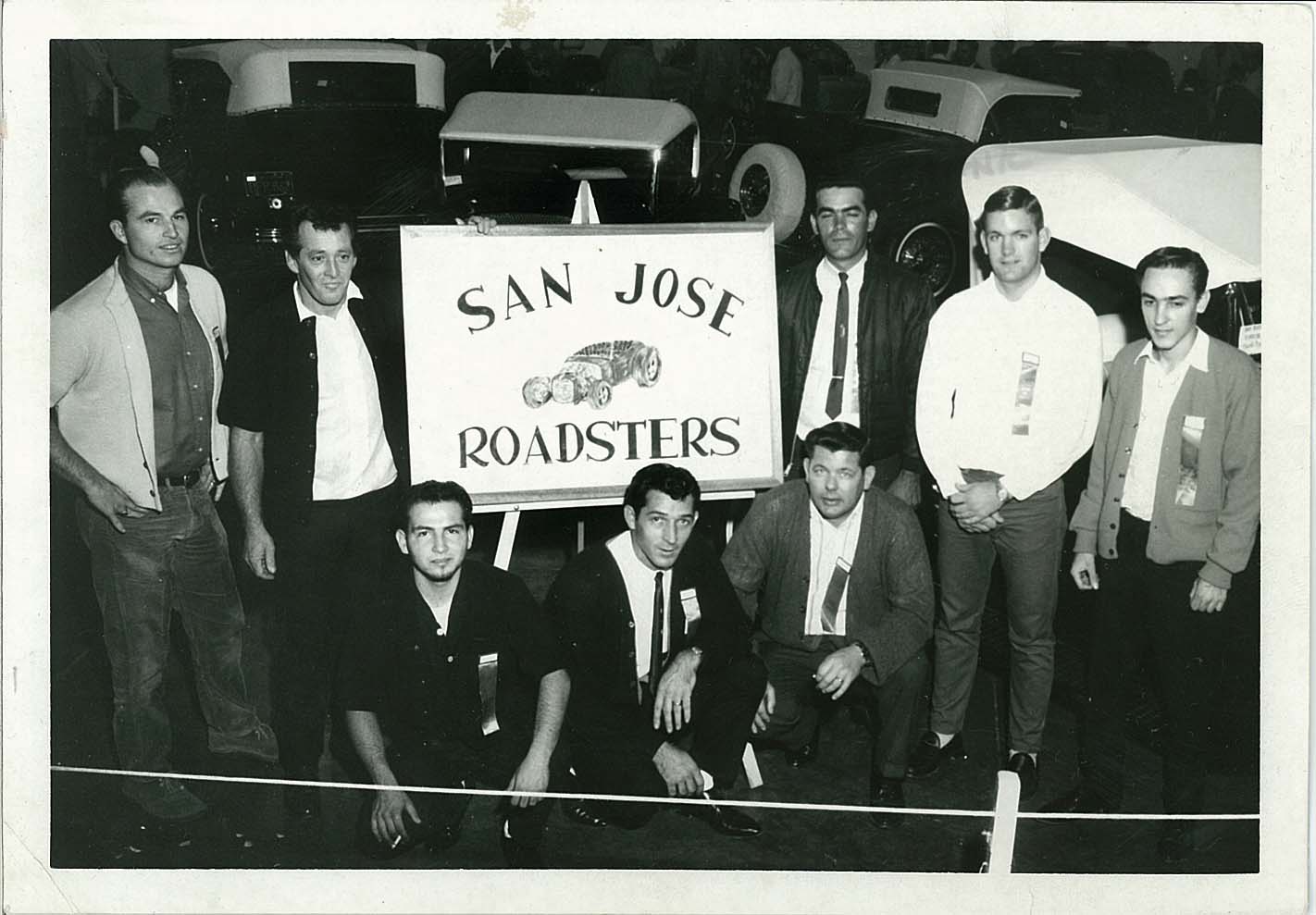 The San Jose Roadsters were featured at the 1966 Cars and Stars show in San Jose. Pictured are (Bottom left to right) Art Mata, Vince Burgos, Bob Maiwale, top row (left to right) Chet Lehman, Ray Silva (club founder), Frank Rocha, Steve Kirby and Les Erbin.