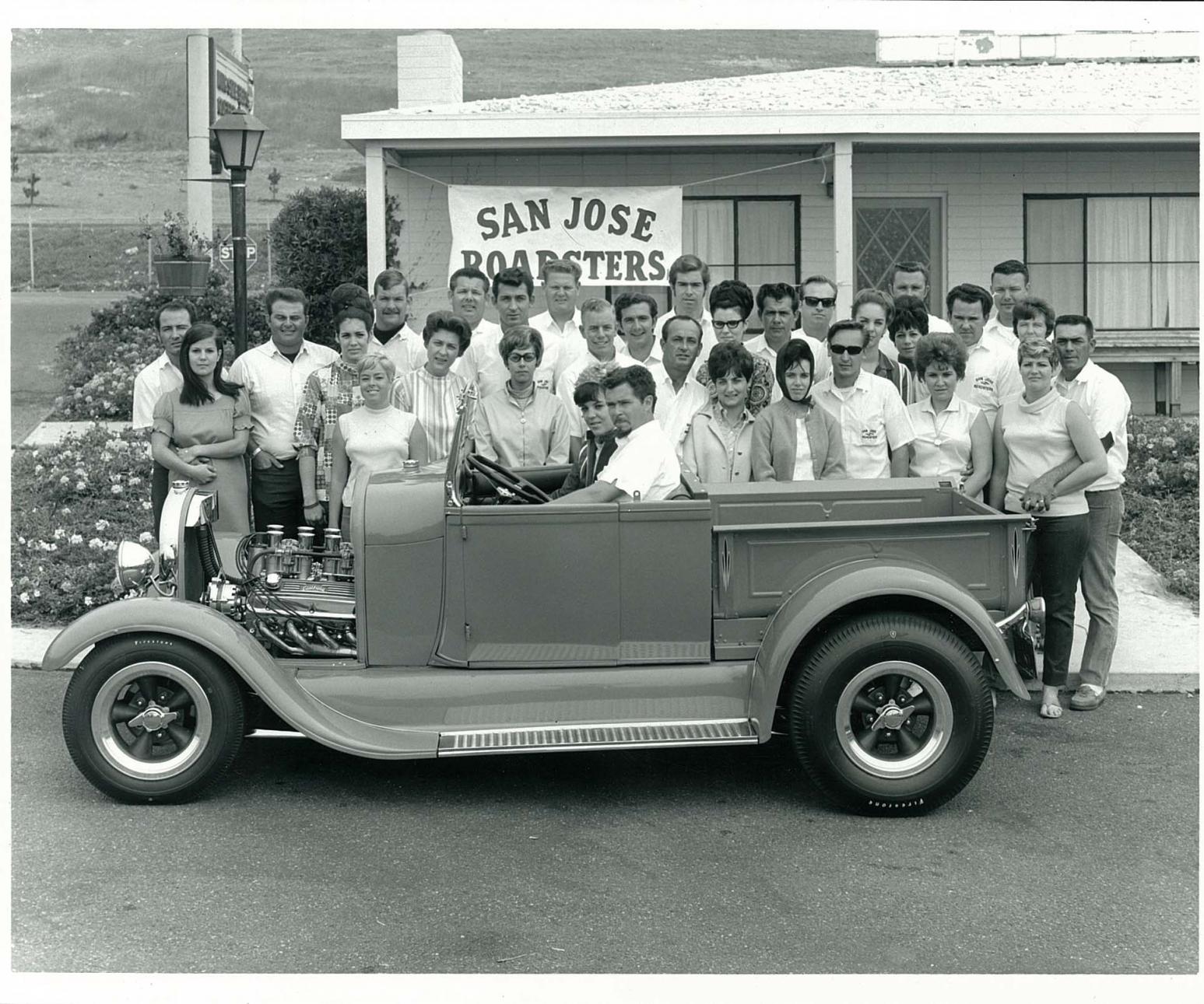 The San Jose Roadsters gather for a group picture at the Pismo Beach Roadster Roundup circa 1968. That's Joe Cardoza and friend in his roadster pickup.