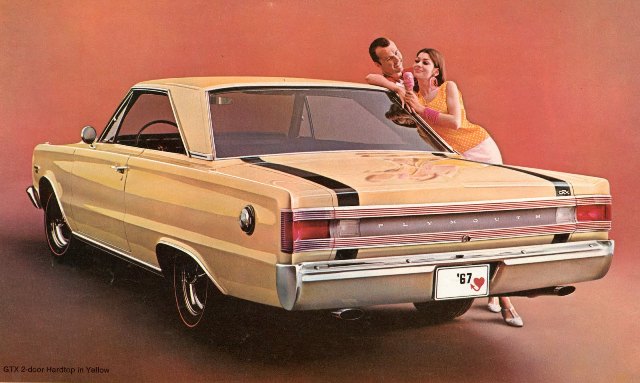The 1967 Plymouth Belvedere GTX series was a new high performance model introduced specifically for the performance minded buyer. The GTX models were available in both a hardtop and convertible version. The models were designed with a special dark textured silver paint highlighted grille and a rear deck trim. The vehicles also offered GTX style dual scoops on the hood, chromed dual exhaust outlets, a pit stop gas cap, and special red streak tires. The heavy duty suspension and functional styling were all attuned to GTX’s high performance capabilities that the consumers really enjoyed.