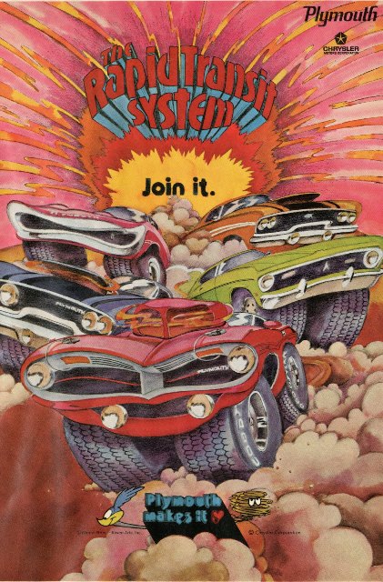 The 1970 Plymouth advertising campaign included the "Rapid Transit System" which appealed to many Plymouth buyers. The campaign was an effective effort to show the years of racing among Plymouth performance cars at Daytona Indianapolis, Riverside, Irwindale, Cecil County. It was based on the race cars themselves, drag racing cars Grand National stockers, rally and Championship cars. The Rapid Transit System advertising was very popular among racing fans of all ages.