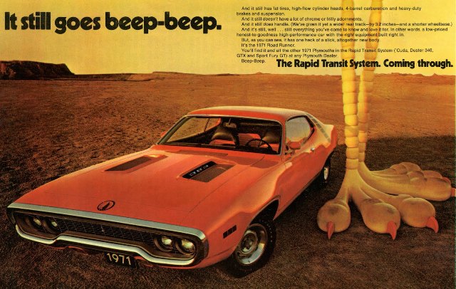 1971 Plymouth Road Runner was a high performance model that offered a great 440 4 barrel V8 type engine. The advertising color pattern wrapping over the roof design was a Road Runner exclusive color keyed design that made the model very popular among the young culture. Plymouth continued to use the Road Runner bird and "beep beep" slogan for its advertising campaign. The three men responsible for the popular Road Runner there were Mr. Robert S. Anderson, Jack Smith, and Gordon Cherry. These men made the population relationship between the Road Runner cartoon and Plymouth automotive designers possible. Throughout automotive history, the Road Runner advertising campaign and Plymouth will always be looked upon as one of the best ideas in history. The Plymouth Muscle cars will continue to be popular among many past, present, and future automotive collectors.
