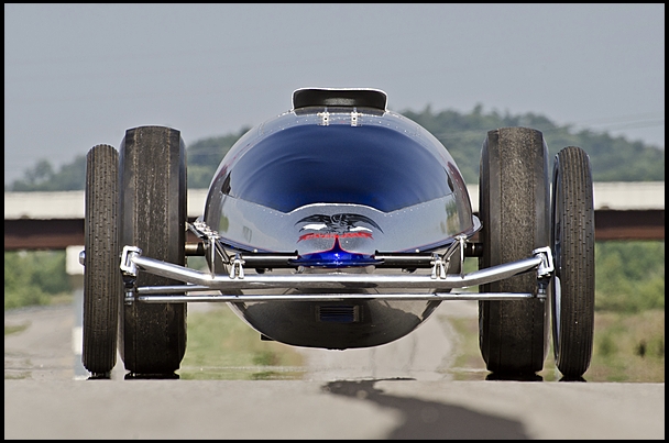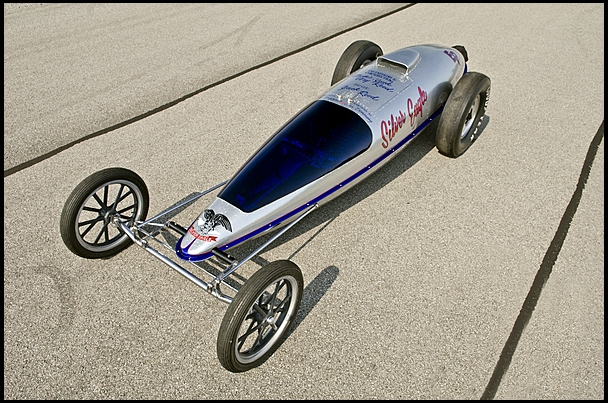 The Silver Eagle’s mechanical complexity is belied by its simple appearance - that of the low-slung, teardrop-shaped speedster common to the Bonneville Salt Flats, its tube front axle, narrow spoked front wheels and rear slicks borrowed from the drag strip. The car’s low profile is made possible by reclining the driver to an almost completely prone position, his view of the bleached horizon facilitated by the plexiglass windshield molded to the body’s wind-cheating contours. The drive motor, batteries and onboard systems are neatly packaged in the rear half of the car between the driver’s seat and the tail, where a spring-actuated Simpson cross-form drag parachute mounted to the main frame rails initiates the slowdown from top speed.