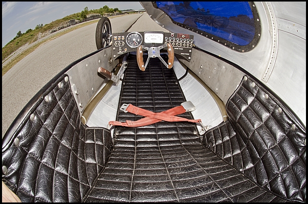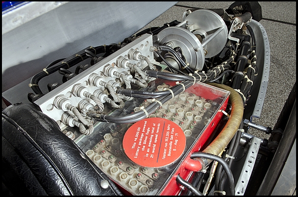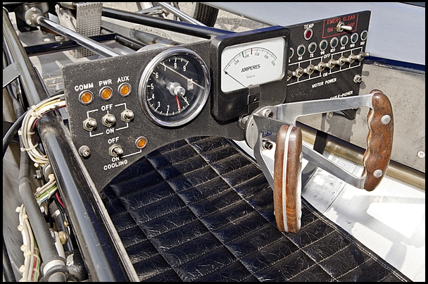 Cocooned in a tubular space frame covered in lightweight sheet aluminum, the driver is faced with a drag racing-style butterfly steering wheel and an instrument panel housing a tachometer, an ammeter and two groups of switches: one group of four to activate the speed controller and main drive motors, onboard systems, instruments and drive motor cooling blower; another group of eight switches to incrementally increase voltage to the drive motor by adding cell groups to the power circuit, the effect on performance similar to shifting through the gears in a conventional transmission.