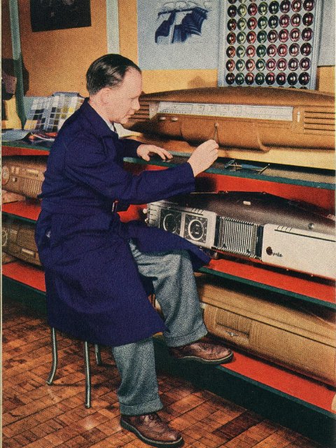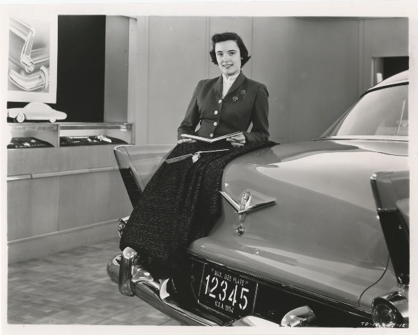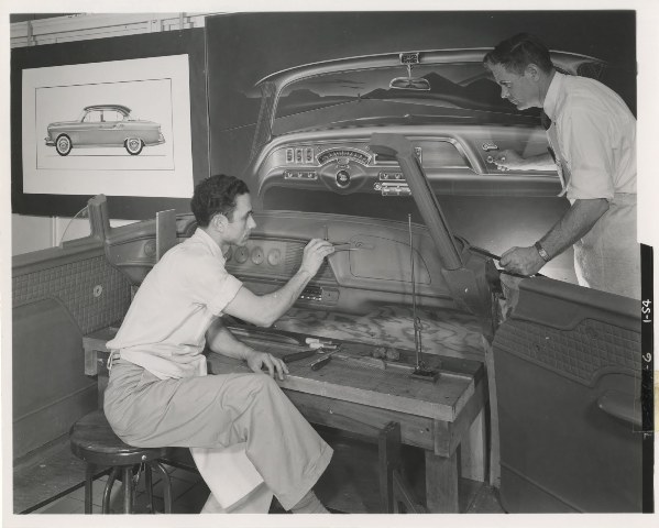Carol Burkheiser was another very talented lady who was also part of the Chrysler Styling department. Mrs. Burkheiser is shown with a new interior upholstery fabric sample featuring metallic threads interwoven through a dark rayon cotton background as she holds one of the several proposed “V” emblems for the new 1956 Plymouth trunk lid design. The styling development body exteriors designers were very hard at work on automotive appointments for future products with the styling department.