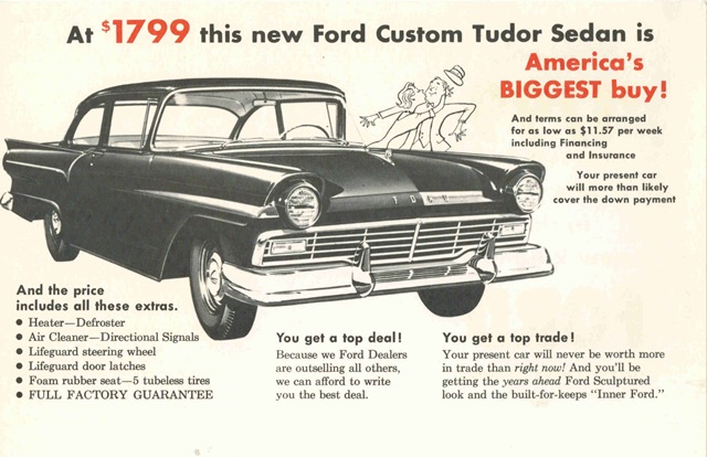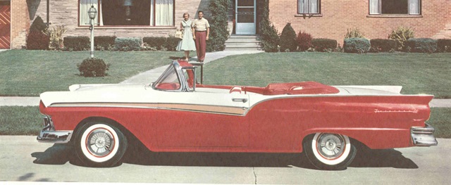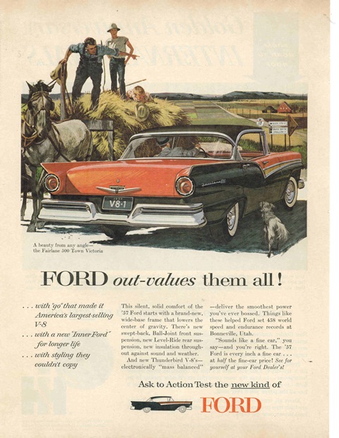In 1957, Ford also introduced the Ranchero model which was a convenient way of combing a passenger car along with a light duty truck design. In 1957, Tennessee Ernie Ford, who had his own television show, became one of the sponsors for 1957 Ford models. Overall, 1957 marked one of Ford’s most successful years in which they surpassed Chevrolet in overall sales, the first time since 1935.