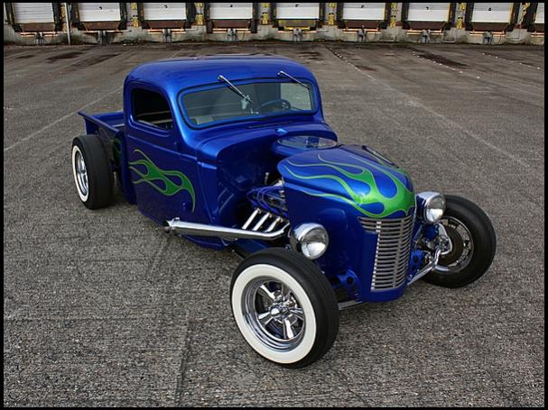 The bodywork boasts custom bright blue metal flake paint with hand-done flames and pinstriping, shaved handles, mirrors and bumpers, and it features a custom nose with open engine bay, which is fully matched to the rest of the truck right down to the pinstriped Cadillac air cleaner and color-matched engine block. The customized bed houses a stainless fuel tank and sits on a bespoke, box section rear frame. The front end received the classic hot rod treatment with dropped spindles, disc brakes and inverted leaf spring, while the rear suspension is upgraded with coil springs and adjustable air shocks.