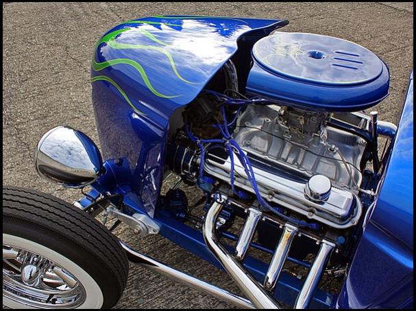 Additionally notable features include 60s-style American mag wheels with wide whites and cheater slicks on the back, custom Old School blue and white two-tone interior with a ’40 Ford dash and Ed Roth-inspired tall shifter, ’59 Eldorado tail lights, pop-out wind screen, and power brakes.