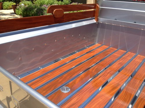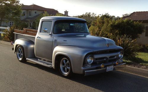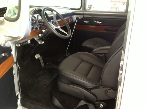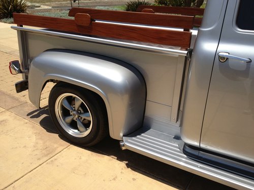 The F100’s cab is equipped with total heat and sound insulation and a CPP tilt hood, plus a new cargo bed and Ford-scripted tailgate with hidden latches. The bed flooring and unique removable rails are custom-built of African Ribboned Mahogany with hidden stainless-steel bolts. The interior features fabulous seats with black leather and vinyl upholstery, custom woodwork, upholstered door panels, and black carpeting. One-piece electric windows, tinted glass, Old Air Products heating and air conditioning, all-new lights and switches, electric wipers, an aluminum billet dash with six VDO gauges, and a custom tilt banjo wheel with horn and turn signals are among the highly desirable upgrades. Riding on American Racing 17-inch wheels with BFG Radial T/A 225/65R17 tires, this excellent F100 is ready to enjoy.