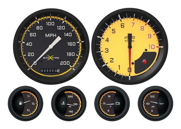 Classic Instruments is pleased to announce the release of the Auto Cross™ series. Featuring a modern sport appearance, the gauges feature matte black, low step bezels with flat glass, and pool cue pointers. The design features clear, concise numerals and indices that are easy to read at any speed. The 200 MPH speedometer and 10,000 RPM tachometer feature etched diffuser rings while the vertically oriented fuel, oil, temperature, and volt gauges feature “eyelids” with their respective ISO symbols. The tachometer features a built in, extremely bright, red, shift indicator light. The Auto-Cross™ series is available in five or six gauge sets or individually with your choice of 3 ⅜″ or 4 ⅝″ speedometer & tachometer and 2 ⅛″ fuel, oil, temperature, and volt gauges. Auxiliary 2 ⅛″ oil temperature and transmission temperature and boost gauges are sold separately. Color selections include gray or yellow. All pre-packaged gauge sets include all necessary sending units and an external shift indicator light controller.