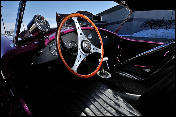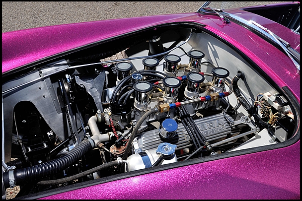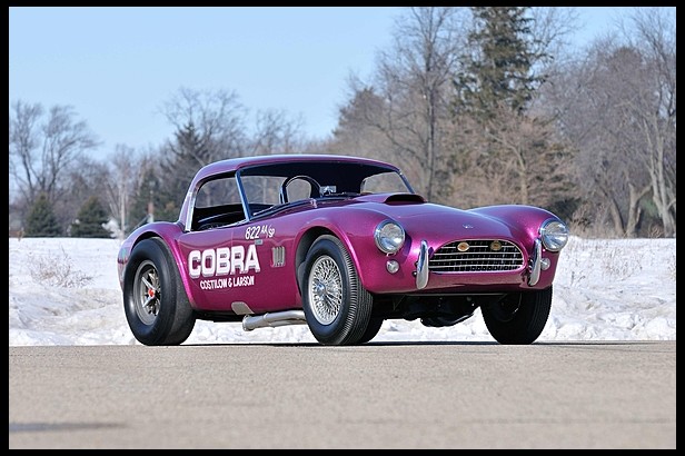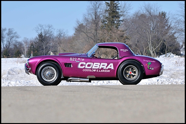 The Costilow/Larson Dragonsnake has been authenticated and certified by the Antique Automobile Club of America (AACA) as a true and correct original car, and has also won that organization’s Senior Award and Race Car Certification badges. It has undergone a completely accurate and show-quality restoration by Ziegler Coach of Los Angeles, CA and is presented exactly as it competed, including the Weber-carbureted 289 Ford V-8 with Ballanger side mount headers, 4-speed transmission, Cobra Sunburst rear wheels with slicks, wire front wheels, removable hardtop and eye-grabbing Magenta metalflake paint.