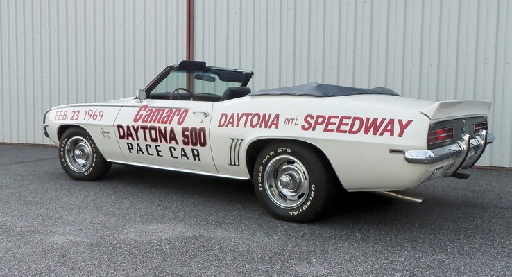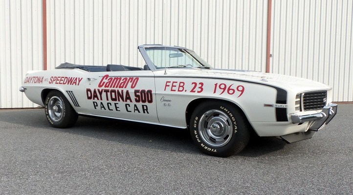 Originally titled to NASCAR co-founder Bill France, Sr., this outstanding Camaro SS396 Convertible served as the official pace car for the 1969 edition of the Daytona ‘500’ race. It also paced the 1969 “Firecracker 400” held on July 4, 1969 at Daytona. Interestingly, driver LeeRoy Yarbrough won both races. The consignor acquired the Camaro during the mid-1980s and at the time, the Camaro was painted silver with a black convertible top but retained its blue interior. It was driven in parades in Atlanta and eventually given a high-quality restoration, which continues to present very well. The Camaro’s early history was researched and confirmed, with the car now offered at auction complete with a copy of the original title to NASCAR signed by William C. France and photographs from the Daytona archives, showing the car’s original license-plate number 8W16640, which matches the plate number on the car’s title. Accurately reproduced graphics from the Camaro’s use at Daytona in 1969 adorn its flanks.