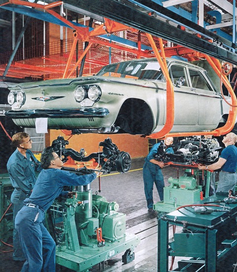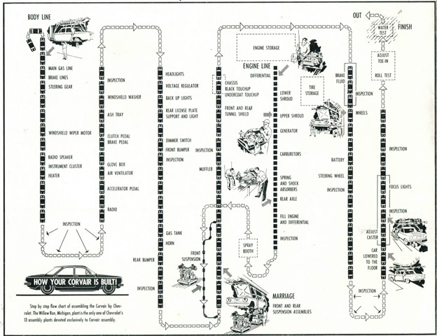The Chevrolet - Willow Run Plant was one of three Chevrolet assembly plants which built Corvair models, other locations included Kansas City, MO and Oakland, CA. The Willow Run plant, however, was the only Chevrolet facility that was devoted exclusively to Corvair assembly. In the beginning Chevrolet Engineers made every effort in creating and constructing the Corvair models and it was served to be an efficient operation for building. The Willow-Run assembly plant was divided into six sections.
