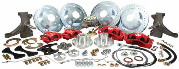 Big Brake kits requires a 17" diameter disc brake type wheels (easy-to-use wheel template available). Our Big Brake rear kit utilizes a 12" rotor and Lincoln (e-brake style) caliper. Kits are complete and include front and rear rotors, front and rear loaded calipers, hoses, front bearings and seals, front and rear mounting brackets, forged aluminum hubs, rear hard lines, rear e-brake cables (or adaptors), all necessary hardware and include a 4-wheel disc master cylinder and proportioning valve kit.