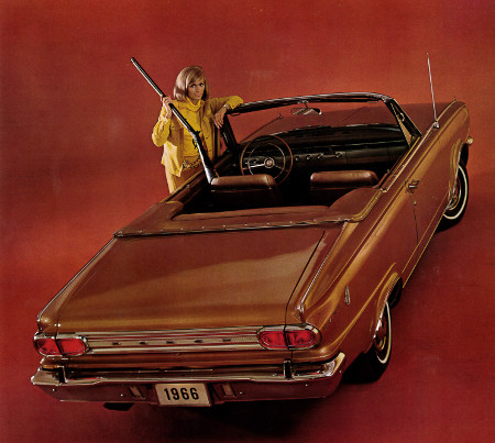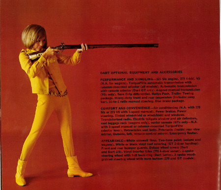 The Dodge Dart convertible advertising campaign for 1966 featured a young lady with a muzzle loading rifle and a Dodge Dart convertible automobile. The copy for the advertising stated “Careful, it's loaded. Check these Dart 66 options and accessories. Complete? You bet. The Dart theory: no reason you shouldn't enjoy all the comfort and conveniences you want in a car just because it sells at a compact price. Another statement from the advertising copy was, “Fire up that snarl under the hood.”
