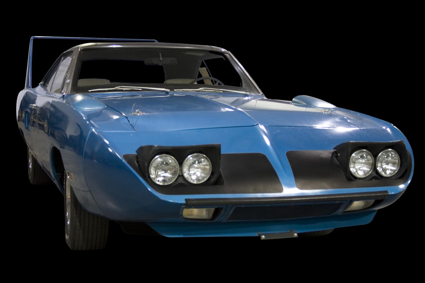 the early 1960s. Also memorialized in several songs and represented in the exhibition is Pontiac’s GTO. Fans of the Ford Motor Company will appreciate a Boss 429 Mustang, offerings from Shelby, powerful Torinos and a limited edition Mercury Cougar Eliminator, among others. The final “Big Three” automaker, Chrysler, has a slew of bruisers in the exhibition, including a unique pairing of their two NASCAR-inspired “winged” cars, the 1969 Dodge Charger Daytona and the 1970 Plymouth Superbird. The Daytona is beautifully restored, while the Superbird is the lowest mileage (approximately 300 miles), unrestored example in existence.