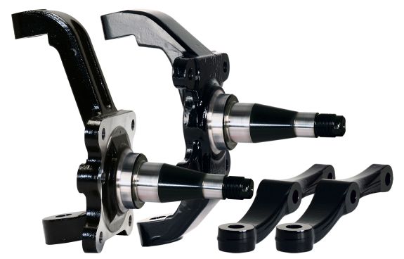 The one-piece forged steel body is lightweight and the bolt-on steering arms allow the same spindle to be used on either side of the vehicle. The steering arms may also be inverted to help make corrections for bump steer based on steering linkage location. The spindle is ½-inch taller than OE spindles, which raises the front roll center geometry for improved handling, said the company.
