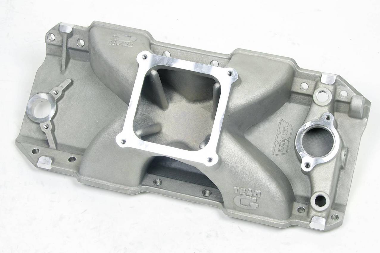 more horsepower and torque then similar intakes currently on the market. The permanent mold casting process produces a lighter and more consistent casting. The results are smoother intake runners that optimize atomization of fuel, mixing of fuel/air and the distribution of the fuel/ air to the cylinders creating more power. Each casting is CNC machined to give an exact fit and exact port match to the heads with ports measuring 1.87¡¨H and 1.60¡¨ W. The 7621 makes best power from 3000 to 7500 RPM¡¦s. The single plane design utilizes a 4500 carburetor mounting flange. The 7621 Team G has a front height of 5.96¡¨ and a rear height of 5.96¡¨.