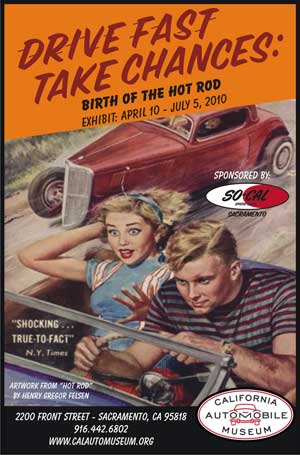 The exhibit, Drive Fast, Take Chances: Birth of the Hot Rod is sponsored by So-Cal Speed Shop, Sacramento opens April 10 and runs through July 5. It explores the hot rod culture that grew out of the dry lakebeds of California in the post-World War II years and ultimately spread to drag strips and back roads