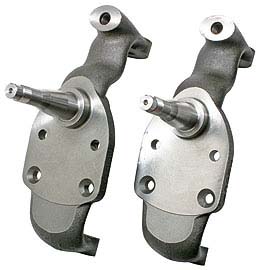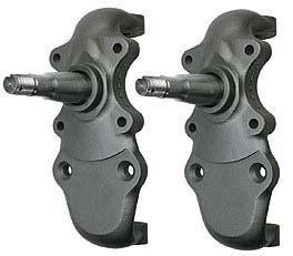 The fullsize spindles are cast from the highest quality Ductile Iron with CNC machined Chrome-moly pins, while the midsize spindles are made from 1050 forged steel. The unique design accepts factory ball joints and stock steering arms.