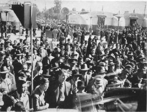 Mexican interest and hospitality began even before the caravan of 44 automotive units transporting the exposition crossed the international bridge at Laredo. Mexican officials attended the Laredo performances and Mexican motorcycle police escorted the procession the entire distance from the border to Mexico City. At San Cristobal, 25 kilometers from the city, the expedition was welcomed by Lic. Jimenez Rueda, representing Dr. Joese Siurob, Governor of the Federal District. He rode with Ivan C. Dresser, Managing Director of General Motors de Mexico, and John M. Jerpe, Director of the Parade of Progress, at the head of the caravan as it paraded through the city. A crowd, estimated at 150,000 men, women and children, lined the streets for their first view of the most impressive display of streamlined highway transports ever to visit their native city.
