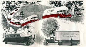 Every precaution is taken for safe driving. Navigation lights, dual rear-vision mirrors, and directional arrows are auxiliary aid to highway safety. In traveling, the units are spaced at 200-foot intervals as a courtesy to other motorists.