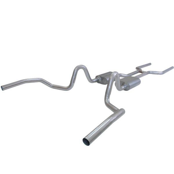 The system is a true-dual design that runs from the transmission cross member, through a welded H-Pipe assembly into 2.50" Super 40® mufflers and then through tailpipes that exit straight out the back under the bumper. Constructed of 409S stainless steel for maximum durability and covered by our