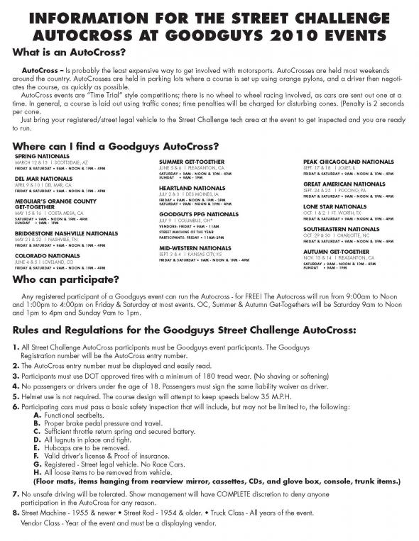 Four classes of autocross competition will be offered in Kansas City, Joliet, Pocono, Texas and Charlotte including the Street Machine (‘55 & newer), Street Rod (‘54 & older), Trucks (all years through ‘72) and the Vendor class (all years through ’72). Each class winner will get a set of BF Goodrich tires as well as an award and a spot in the event winner’s circle!