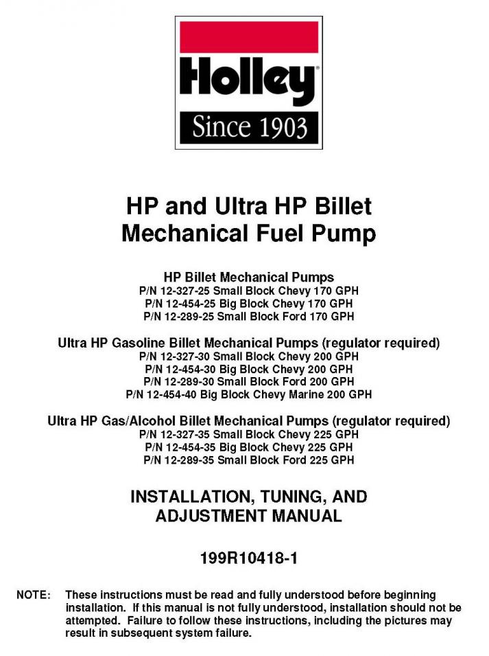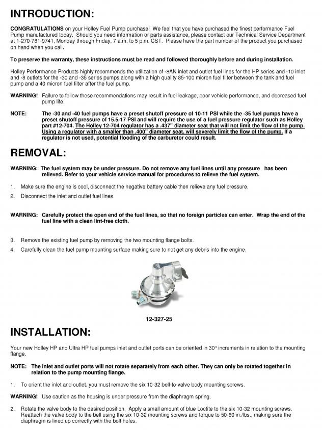 Fittings already installed. The base can be rotated independently from the top so it can be tailored to your application. The HP series has a free–flow number of 170GPH and a pre–set idle fuel pressure of 7.5PSI. No regulator is required. PART #: 12-454-25. Holley Performance Products highly recommends the utilization of -8AN inlet and outlet fuel lines for the HP series and -10 inlet and -8 outlets for the -30 and -35 series pumps along with a high quality 85-100 micron fuel filter between the tank and fuel pump and a 40 micron fuel filter after the fuel pump.WARNING! Failure to follow these recommendations may result in fuel leakage, poor vehicle performance, and decreased fuel pump life.